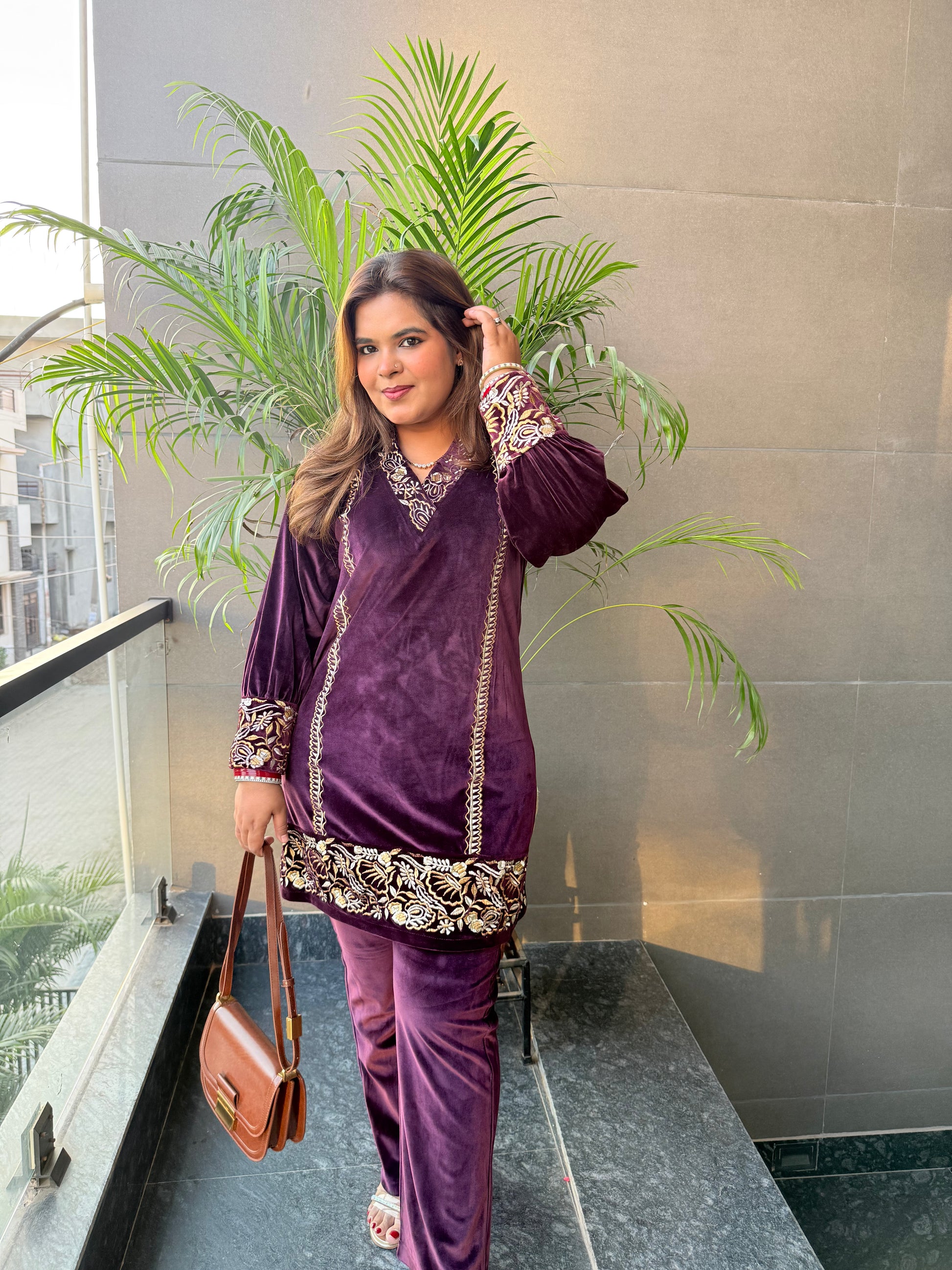 Draped in gorgeous deep purple velvet, accented with intricate gold embroidered work on the neckline and cuffs. Perfect for a festive winter evening.