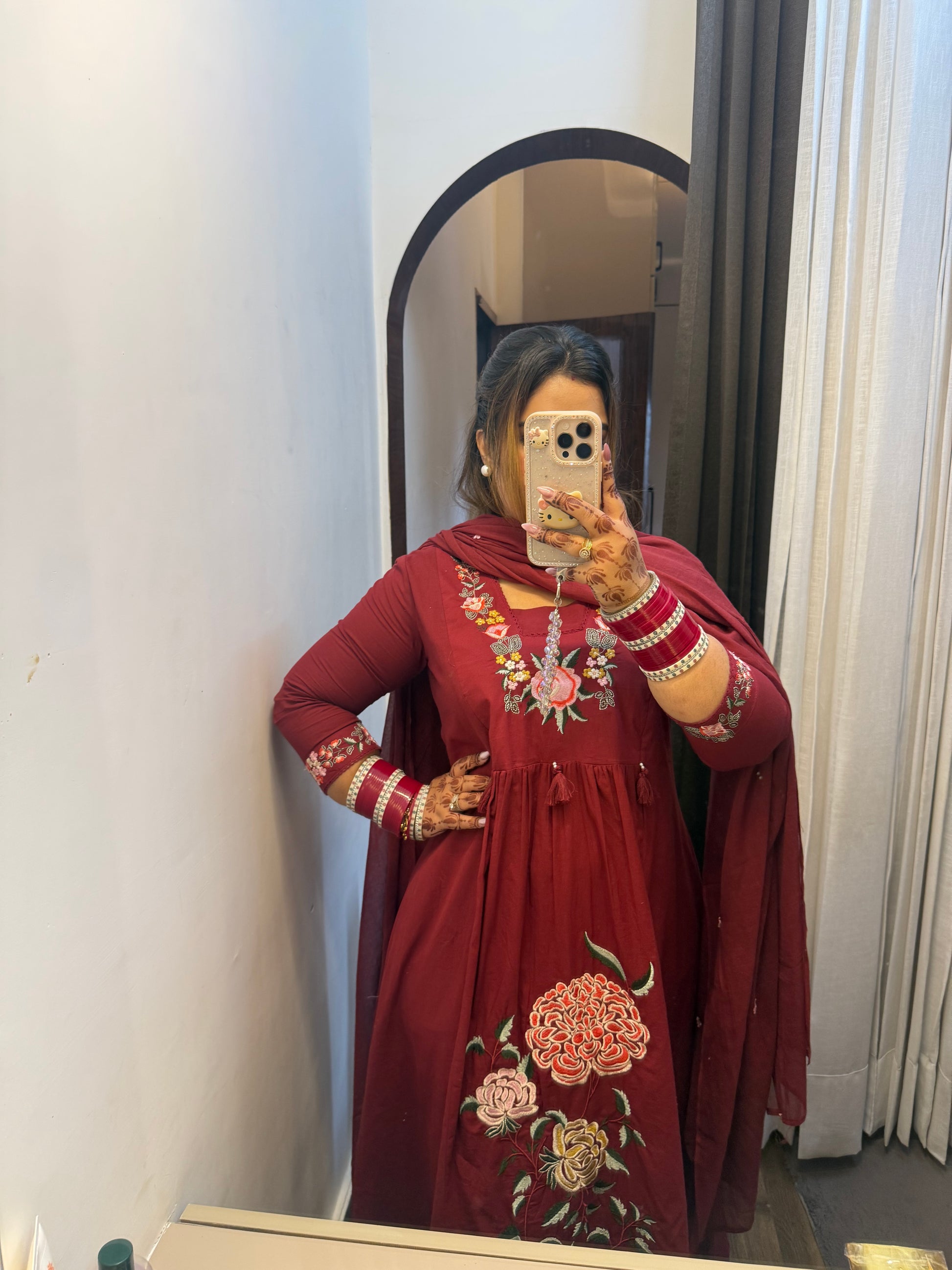 Embroidered kurta with straight cotton lowers along with floral small booties on duppata ✨